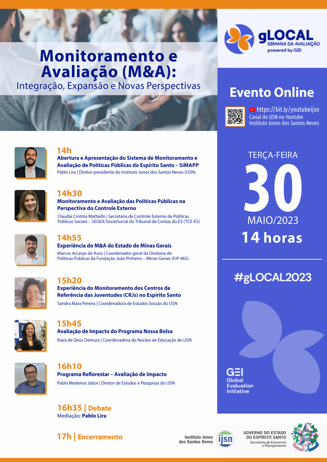 O Instituto Jones dos Santos Neves (IJSN) vai fazer parte da programação da Semana de Avaliação gLOCAL 2023, promovida pela Global Evaluation Initiative (GEI). O encontro acontece na próxima terça-feira (30), a partir das 14h, com transmissão pelo canal do IJSN, no YouTube.