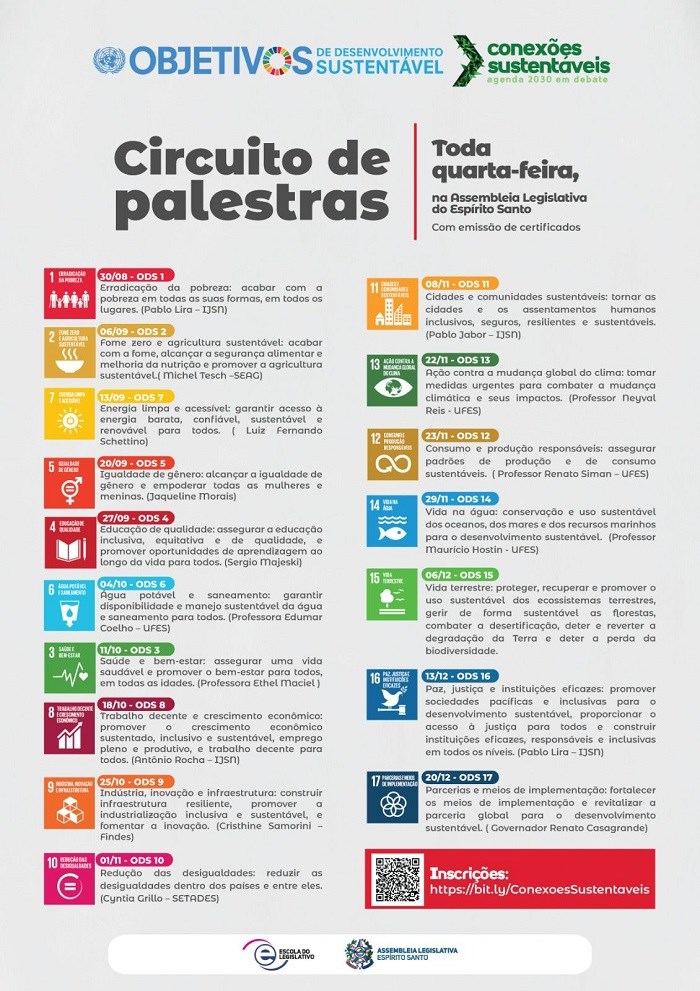 - 20/12 – ODS 17 – Parcerias e meios de implementação: fortalecer os meios de implementação e revitalizar a parceria global para o desenvolvimento sustentável (Palestrante: Renato Casagrande – governador do Estado)